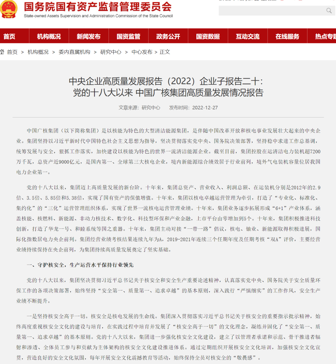 12月27日,國務(wù)院國資委官網(wǎng)刊發(fā)黨的十八大以來中國廣核集團高質(zhì)量發(fā)展情況報告,報告從多個角度展示中廣核近十年的成績和發(fā)展,聚焦安全生產(chǎn)、科技創(chuàng)新、產(chǎn)業(yè)布局、深化改革、黨的建設(shè)、社會責(zé)任等方面,展現(xiàn)中廣核持續(xù)推動高質(zhì)量發(fā)展,加快建設(shè)世界一流企業(yè)的穩(wěn)健步伐。