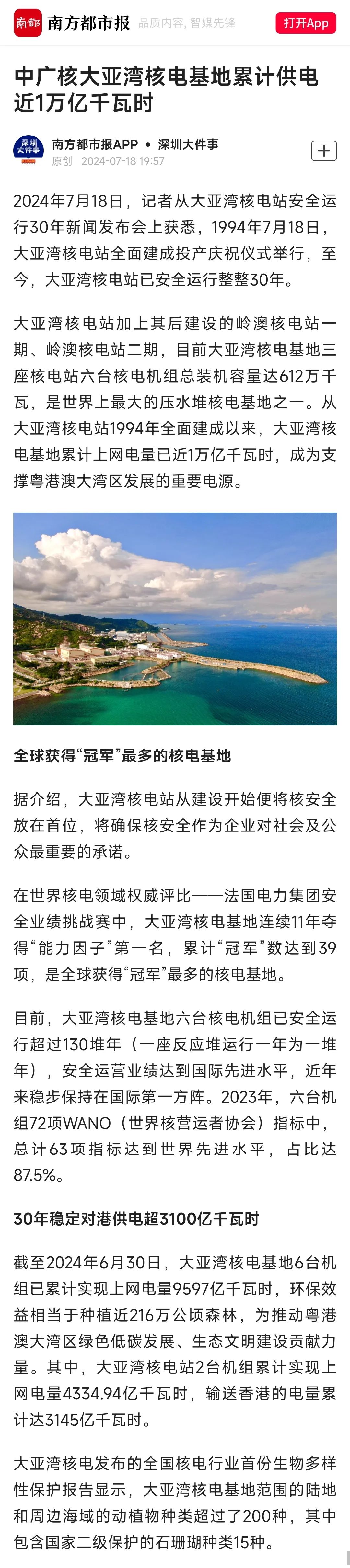 今年,中廣核廣東大亞灣核電站迎來投產(chǎn)三十周年。從大亞灣核電站1994年全面建成以來,大亞灣核電基地累計(jì)上網(wǎng)電量已近1萬億千瓦時(shí),為粵港澳大灣區(qū)的發(fā)展提供了堅(jiān)實(shí)的能源保障。30年的穩(wěn)健發(fā)展使得大亞灣核電站不僅成為了支撐我國(guó)核電強(qiáng)國(guó)夢(mèng)想的關(guān)鍵力量,也成為了改革開放政策下成功發(fā)展的典范。